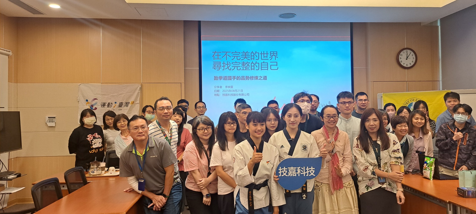 B區也舉辦了多場金牌選手講座,其中在技嘉舉辦的專場,由跆拳道品勢好手李映萱與企業員工面對面交流。她不僅分享多年來在國際賽場的心路歷程,更以堅毅精神鼓舞大家勇於突破自我、挑戰極限。另一場在功得電子舉辦的活動則由跆拳道品勢選手李晟綱登場,親自示範跆拳道擊破木板的震撼瞬間,帶動現場熱血氛圍。即席互動結合生動教學,不僅展現專業技術,也讓員工親身體驗武術的力量與專注,贏得熱烈掌聲。